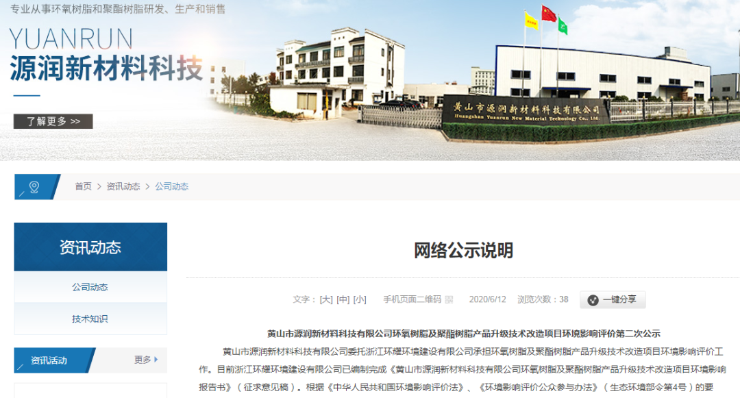 前不久,黄山源润新材料在其官网上公布其环氧树脂及聚酯树脂产品升级技术改造项目环境影响报告书。