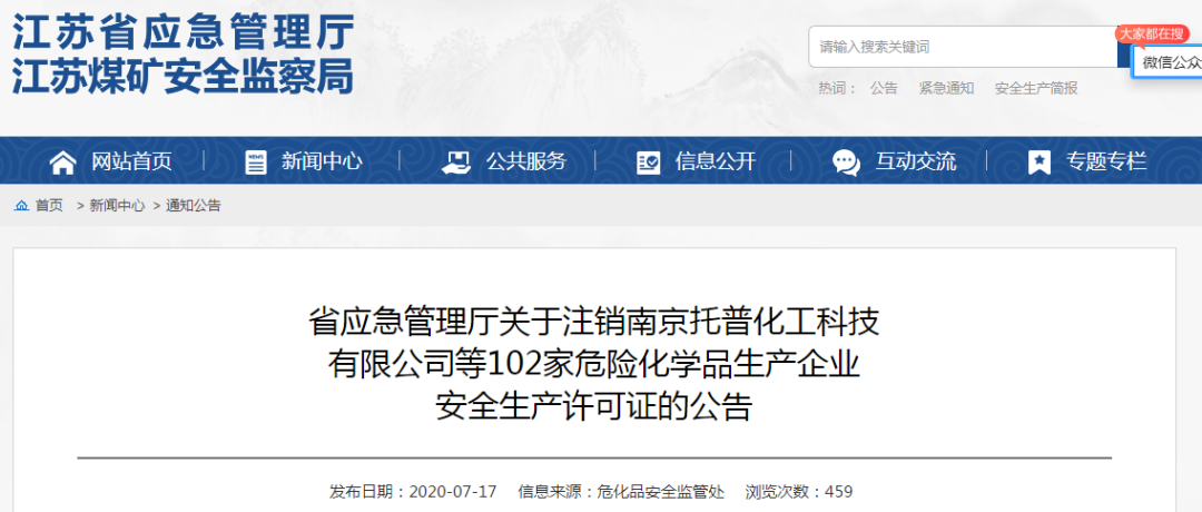 根据各设区市应急管理局申请,南京托普化工科技有限公司等102家危险化学品生产企业(见附件),终止危险化学品生产活动。根据《危险化学品生产企业安全生产许可证实施办法》第四十条规定,注销上述企业《危险化学品生产企业安全生产许可证》,现予公告。