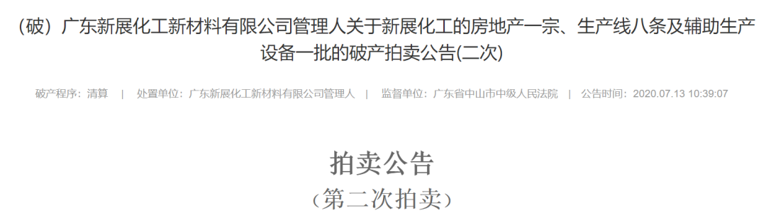 近日,广东新展化工新材料有限公司发布拍卖公告,称广东新展化工新材料有限公司管理人将于2020年8月3日10时至2020年8月4日10时止(延时的除外),在淘宝网拍卖(变卖)网络平台上(网址:https://sf.taobao.com)进行公开拍卖活动。