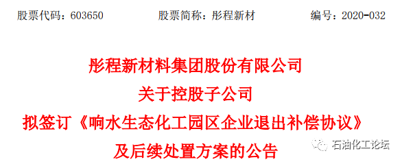 7月15日,彤程新材料集团股份有限公司发布公告称,其子公司彤程精细化工(江苏)有限公司拟签订《响水生态化工园区企业退出补偿协议》,正式退出响水工业园。