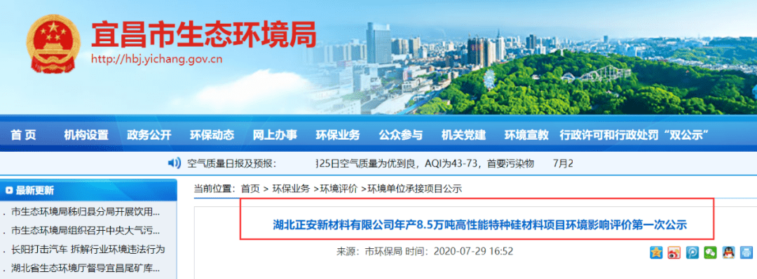 昨日,宜昌市生态环境局发布了湖北正安新材料有限公司年产8.5万吨高性能特种硅材料项目环境影响评价第一次公示。