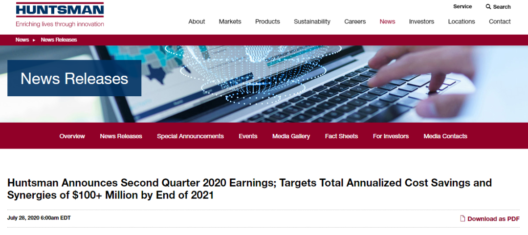 近日,亨斯迈在其官网公布2020年第二季度收益,2020年第二季度总营收15.9亿美元,净亏损为5900万美元。