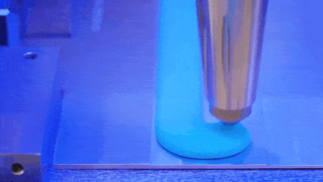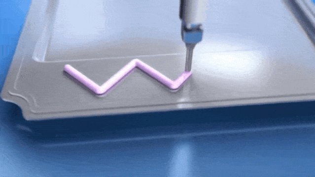 从动图展示的情况来看,设备点胶不成问题,但是胶体已经呈现出很笔挺的外立面,可以说基本接近工厂压缩气体能力的上限。