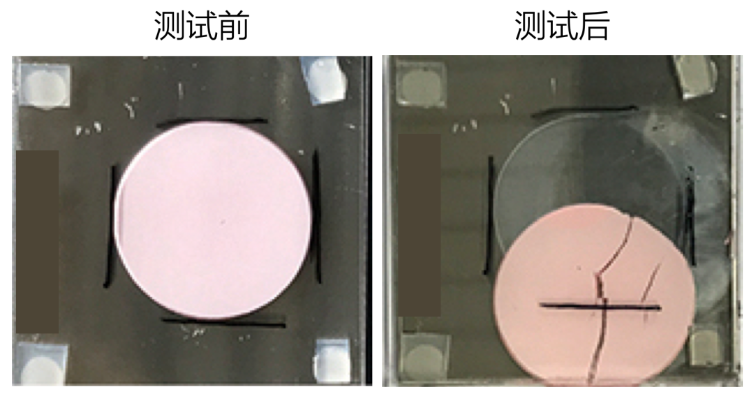 这项测试的结果肉眼可见。下面的图片就明确告诉我们,粉色的导热凝胶出现了明显的向下垂流以及开裂,未通过测试!