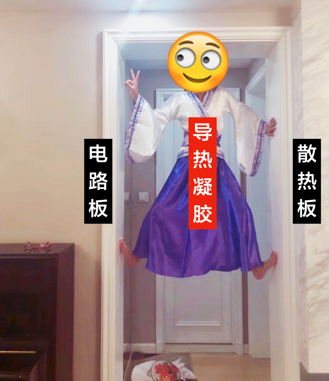 因为导热凝胶就像图片中这个把自己撑在两面墙之间的小朋友,只要两侧的支撑稍有变化,她就必然出现向下的“垂流”。