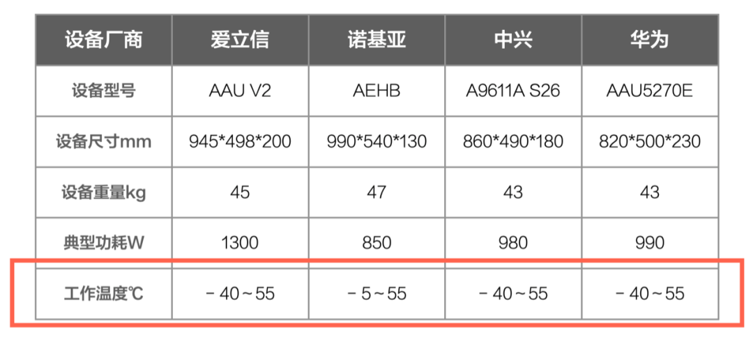而且,5G设备的工作温度并没有因为功率的数倍增加就放宽标准,几个大厂还是很一致的把温度上限都设定在了55℃。