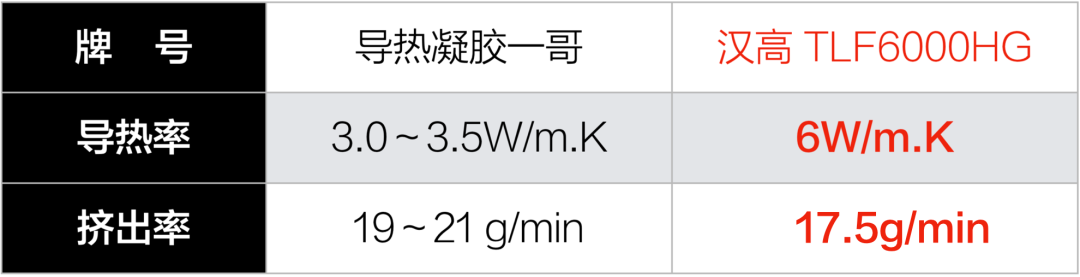 这种担心有一定道理。不过当看到汉高TLF6000HG的TDS数据,就让人比较放心了——导热率比“一哥”高了将近100%,然而挤出率却和“一哥”基本保持了一致水平!