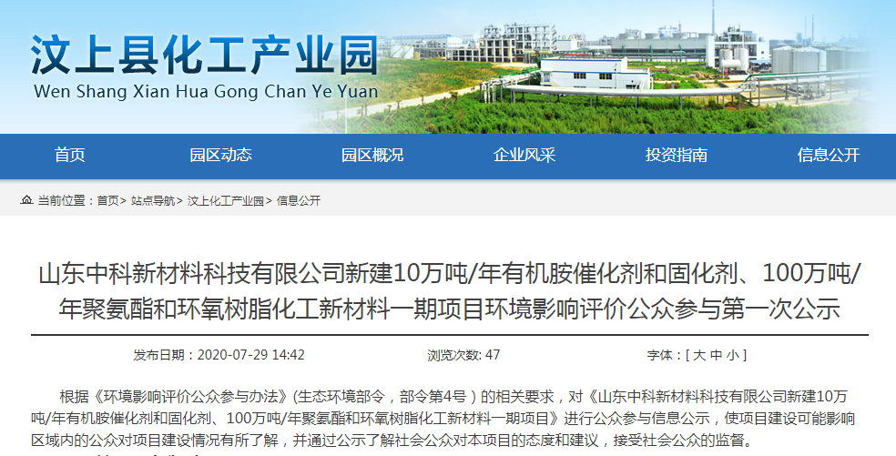 近日,汶上县化工产业园发布了关于山东中科新材料科技有限公司新建10万吨/年有机胺催化剂和固化剂、100万吨/年聚氨酯和环氧树脂化工新材料一期项目环境影响评价公众参与第一次公示。