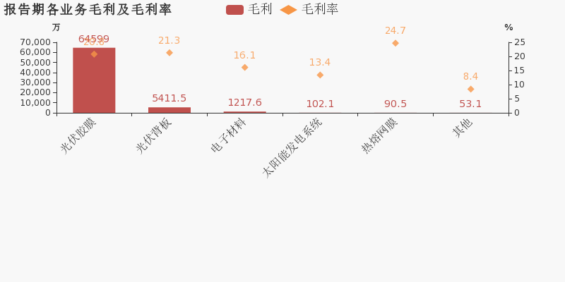 从业务结构来看,“光伏胶膜”是企业营业收入的主要来源。具体而言,“光伏胶膜”营业收入为31亿,营收占比为89.9%,毛利率为20.8%。