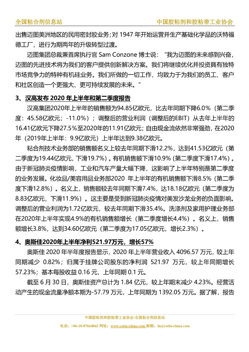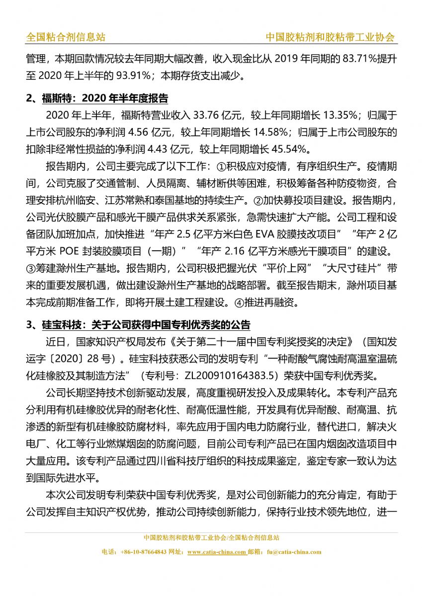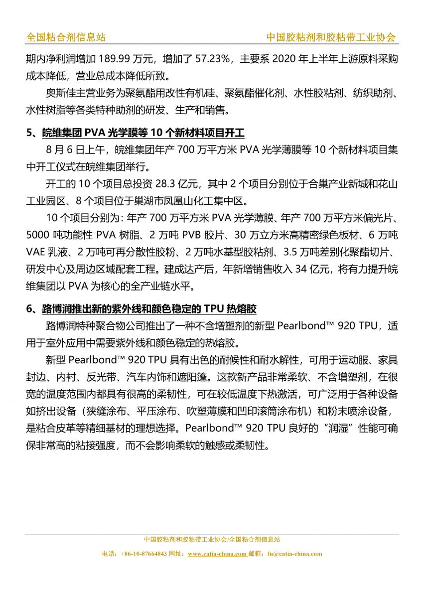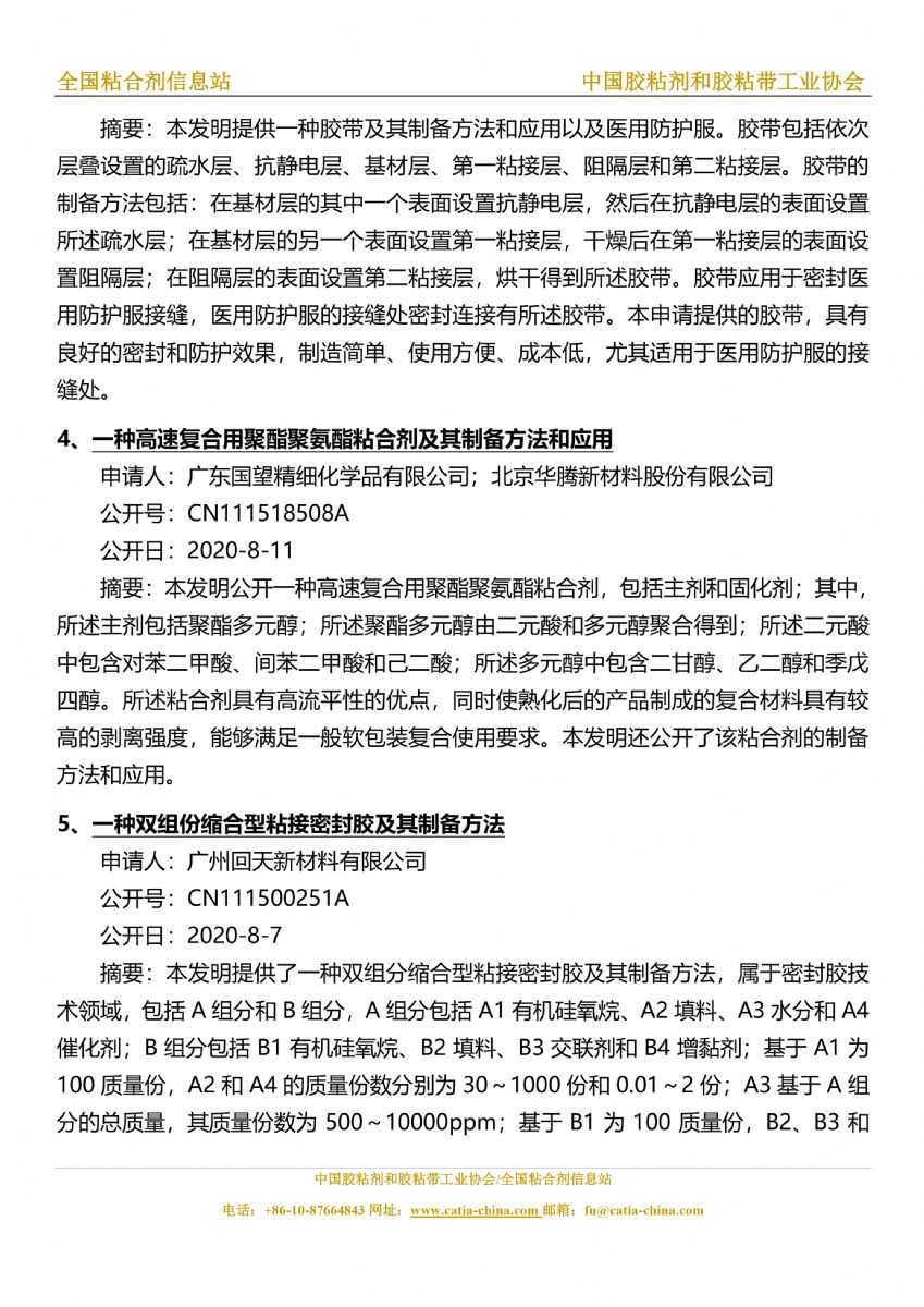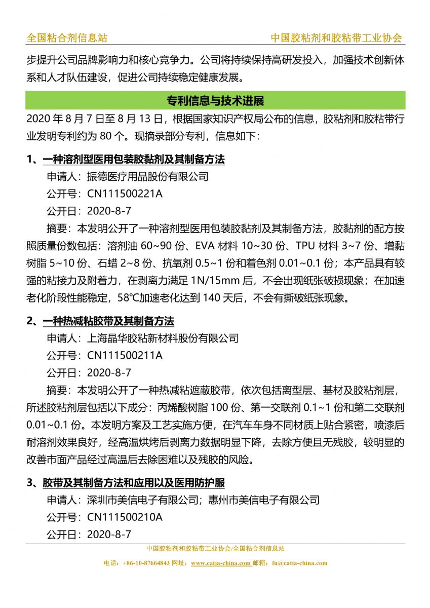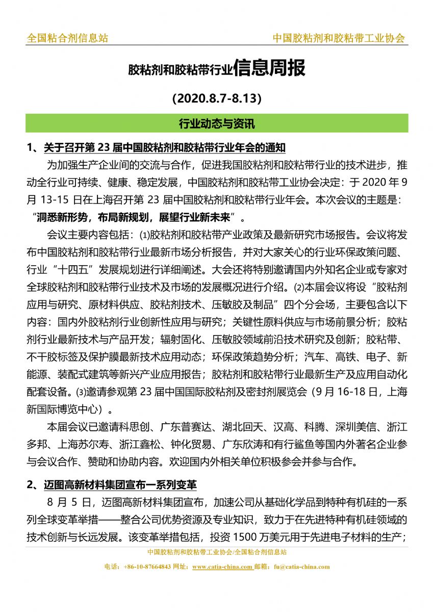 胶粘剂和胶黏带行业信息周报(2020.8.7-8.13)胶粘剂和胶黏带行业信息周报(2020.8.7-8.13)胶粘剂和胶黏带行业信息周报(2020.8.7-8.13)