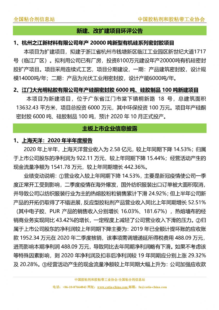 胶粘剂和胶黏带行业信息周报(2020.8.7-8.13)胶粘剂和胶黏带行业信息周报(2020.8.7-8.13)