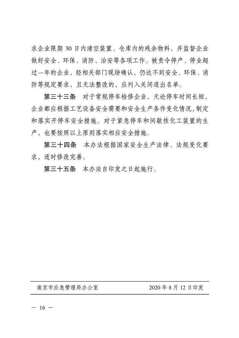 日前,南京市应急管理局联合市工信局、公安局、生态环境局、市场监管局、消防救援支队,在全省率先出台了《南京市化工(危险化学品)企业停产停业复产及关闭退出期间安全管理办法(试行)》,明确全市化工(危险化学品)企业停产停业、复工复产、关闭退出期间的“规范性安全动作”,以及监管部门相对应的联合监管办法,切实防范化解重大安全风险,遏制各类生产安全事故发生。