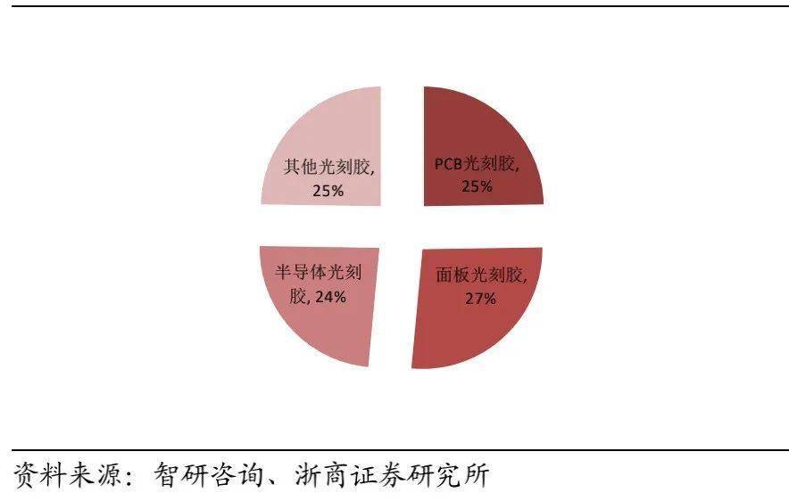 受益于半导体、显示面板、PCB产业东移的趋势,2019年中国光刻胶市场本土企业销售规模约70亿元,全球占比约10%,发展空间巨大。