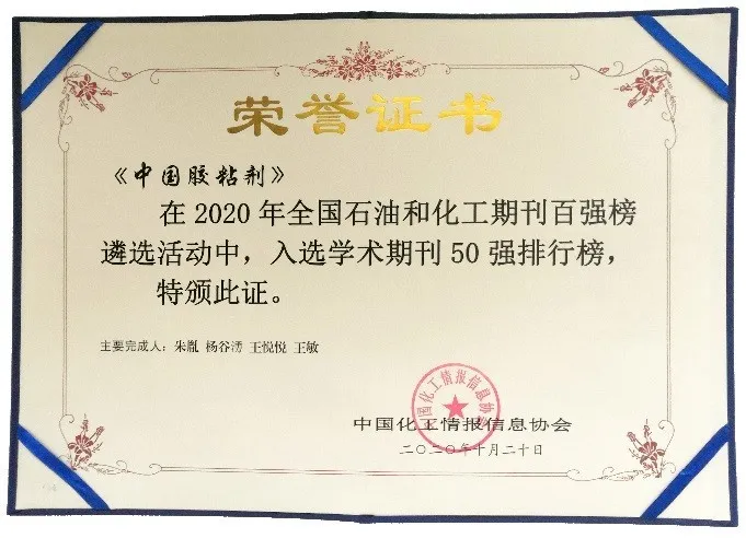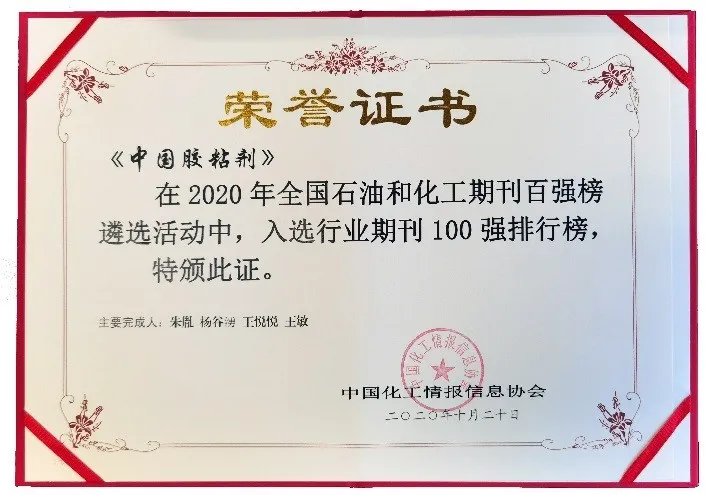 10月28日,由中国化工情报信息协会、中国化工信息中心和中石油经济技术研究院联合主办的“全国石油和化工期刊百强发布会”在重庆举办,会上首次发布了全国石油和化工行业期刊百强单位。在此次评比中,《中国胶粘剂》杂志榜上有名,入选“全国石油和化工行业期刊100强排行榜”和“学术期刊50强排行榜”。