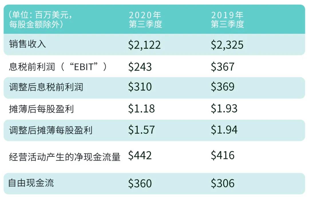 业绩报告指出,该公司销售额达到21.22亿美元,调整后息税前利润为3.10亿美元;摊薄后每股收益为1.18美元;经营活动产生的现金净额4.42亿美元,经营活动产生3.6亿美元的自由现金流。