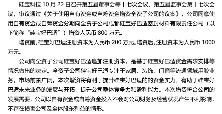 硅宝科技:关于使用自有资金或自筹资金增资的公告