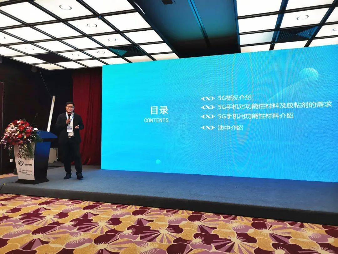 东莞市澳中电子材料有限公司阮镜棠研发经理作了题为《5G手机胶粘功能性材料需求及解决方案》的报告