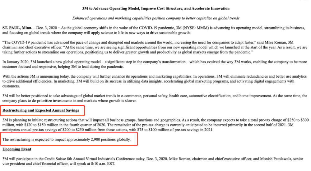 3M公司发布公告表示,公司计划发起将影响所有业务组,职能和地区的重组行动。因此,该公司预计税前总费用为2.5亿至3亿美元,2020年第四季度为1.2亿至1.5亿美元。其余的税前费用目前预计主要在2021年下半年发生。3M公司预计,通过这些措施每年可节省2至2.5亿美元的税前成本,2021年可节省7500万至1亿美元的税前成本。