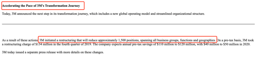 1月28日,3M表示,由于四季度盈利和营收、2020年指引均不及市场预期,外加公司正在面临环保诉讼等费用支出,所以计划2020年在全球裁员1500人,涉及所有业务、职能和地区。