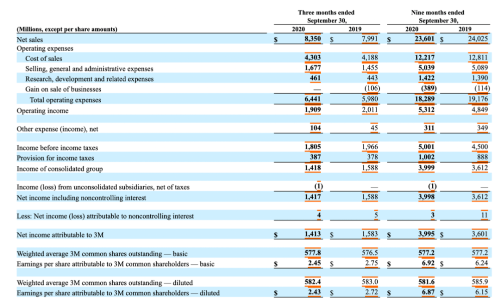 10月27日,3M公司公布2020年第三季度财报,财报显示,3M公司Q3销售额83.50亿美元,去年同期79.91亿美元,同比增长4.5%。归属公司净利润14.13亿美元,去年同期15.83亿美元,同比下降10.74%。摊薄后每股收益2.43美元,去年同期2.72美元。公司的运营现金流为25亿美元。