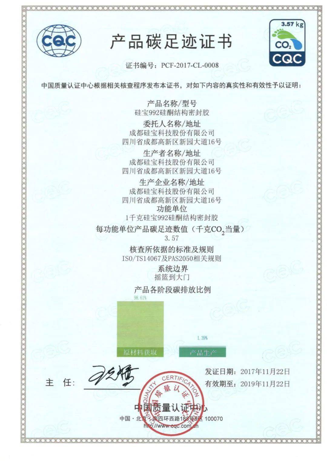 国家级绿色工厂,为绿色发展护航。2020年,硅宝科技获评工业和信息化部第五批绿色制造之绿色工厂。作为新材料制造类企业,硅宝科技始终坚持生产过程绿色化,做到了低能耗、低排放、无污染,各项指标远远低于我国制造业的平均水平;公司产品通过国家建筑材料测试中心(CTC)的“绿色商标使用证明”,中国质量认证中心的碳足迹认证(每1kg产品在生产过程的碳排放仅占全生命周期的1.39%);硅宝科技的主营产品有机硅橡胶,本身也是一种绿色新型材料,在自然环境中可降解、对环境友好无污染。