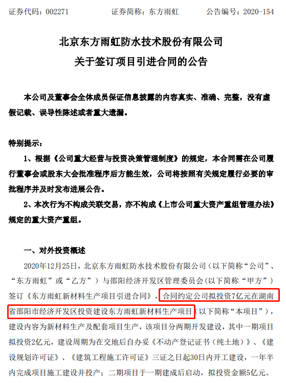 全球有机硅网12月27日讯:全球著名有机硅防水企业东方雨虹(或称“公司”)12月25日午间披露,公司与邵阳经济开发区管理委员会签订《东方雨虹新材料生产项目引进合同》,合同约定公司拟投资7亿元在湖南省邵阳市经济开发区投资建设东方雨虹新材料生产项目, 建设内容为新材料生产及配套项目生产。
