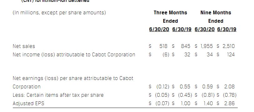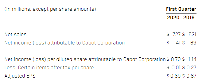 归属于卡博特公司的每股净收益亏损0.01美元,调整后的每股净收益盈利0.77美元,2019年的每股净收益盈利0.39美元,调整后的每股收益盈利0.99美元.