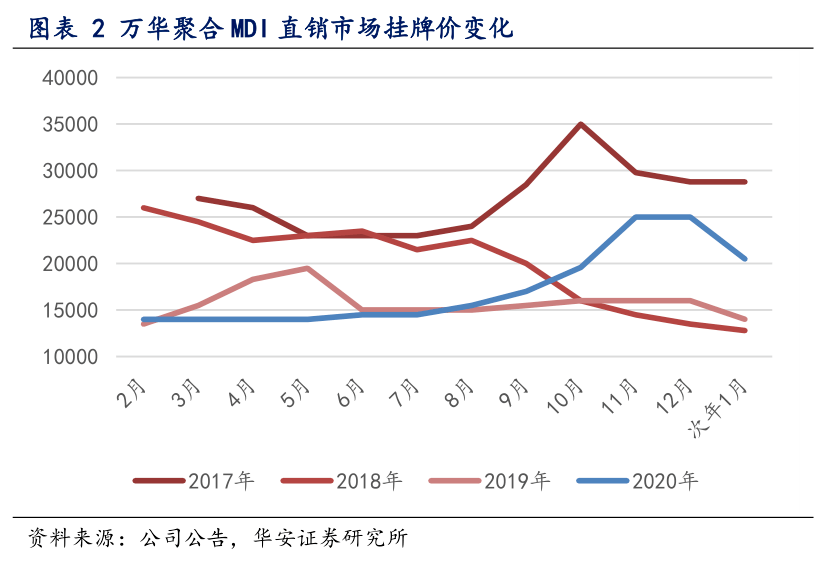 12月31日消息,万华化学公告,自2021年1月份开始,公司中国地区聚合MDI分销市场挂牌价20500元/吨(比2020年12月份价格下调4500元/吨),直销市场挂牌价20500 元/吨(比2020年12月份价格下调4500元/吨);纯MDI挂牌价24000元/吨(比2020年12月份价格下调4000元/吨)。