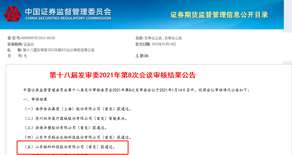1月14日, 山东联科科技股份有限公司(以下简称“联科科技”)首发申请获证监会通过,将于深交所中小板上市。联科科技首次公开发行的股票不超过 4550.00万股,占发行后总股本的 25.00%。据招股书显示,联科科技拟募集资金60897.49万元,此次募集的资金将用于研发检测中心建设、10万吨/年高分散二氧化硅及3万吨/年硅酸、偿还银行贷款、补充流动资金等项目。