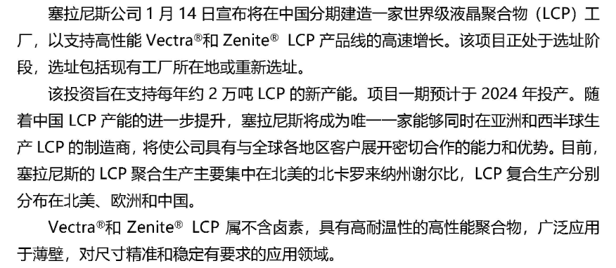 塞拉尼斯拟在华建造世界级液晶聚合物工厂