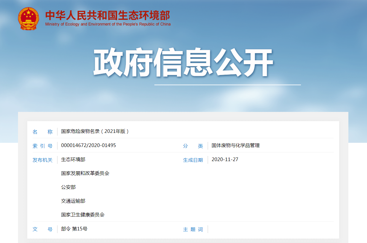 日前,记者从相关渠道获悉,《国家危险废物名录(2021年版)》自2021年1月1日起施行。原环境保护部、国家发展和改革委员会、公安部发布的《国家危险废物名录》(环境保护部令第39号)同时废止。