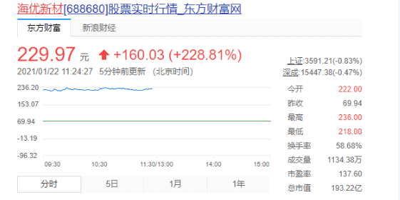 截至上午11时24分,海优新材股价飙涨至229.97元,较发行价格大涨228.81%。