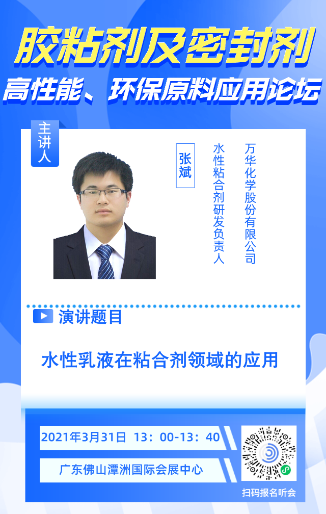 3月31-4月2日,万华化学水性粘合剂研发负责人张斌将携最新报告助力大湾区胶展,详解水性乳液在粘合剂领域的应用,为鞋材、汽车、木工、电子等行业开发环保水性化综合解决方案,欢迎各位听会!