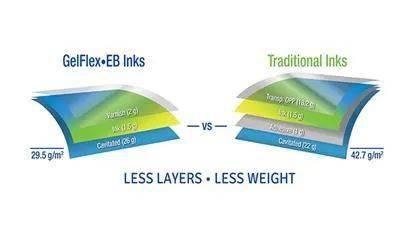 INX国际公司针对CI柔版印刷推出了GelFlex-EB胶质油墨,可以实现与凹印相近的印品质量,并能够提供交联、耐久的油墨膜,因此不再需要复合层,从而降低了成本和整体的包装重量。