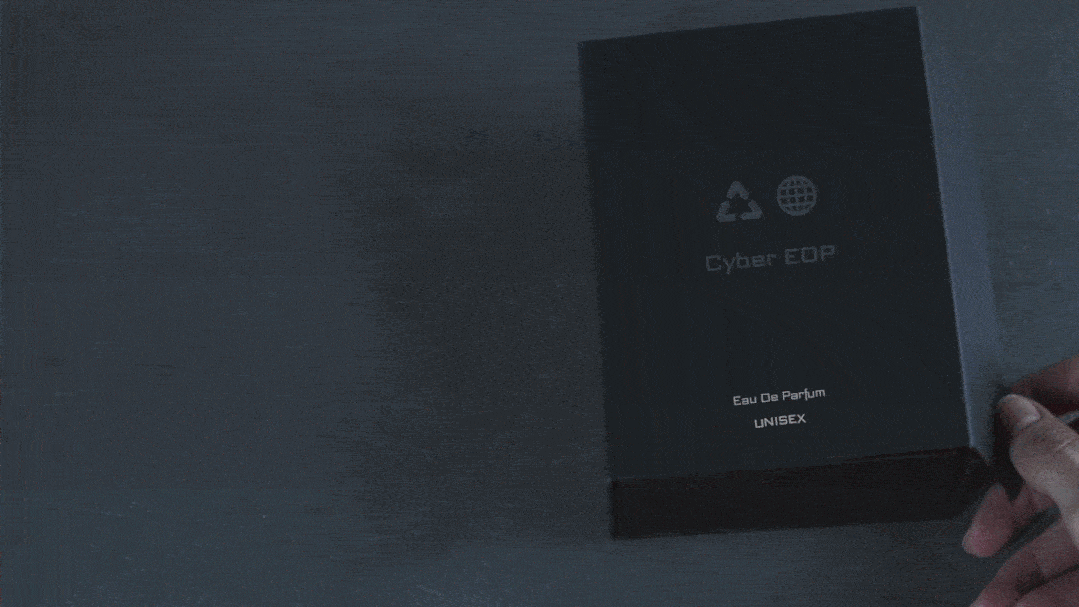 当用户按下标签上的电源按钮时,“CYBER”这个名字就会亮起红色。通用的回收和地球符号闪烁提醒他们,他们应该保护地球和环境意识。标签、瓶盖和外包装是可持续的,香水瓶本身是可重复使用的。
