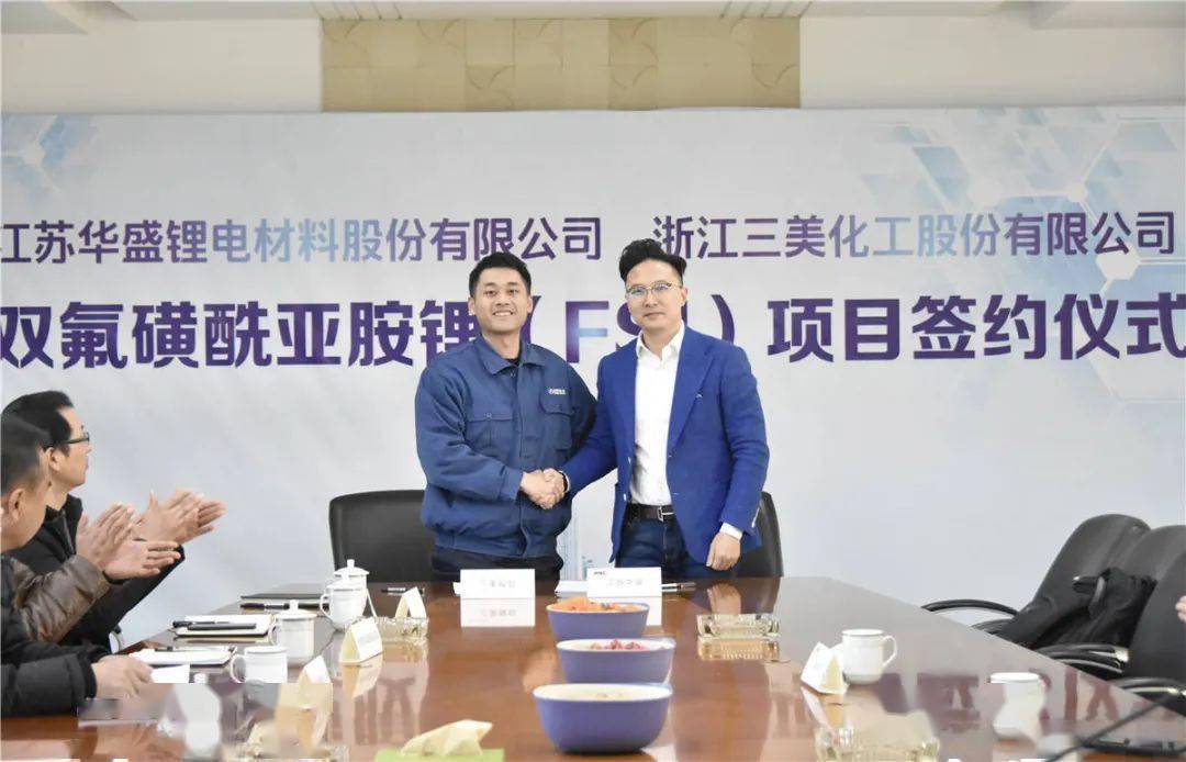 ▲近日,浙江三美化工股份有限公司与江苏华盛锂电材料股份有限公司进行《双氟磺酰亚胺锂(FSI)》项目合作签约仪式,项目成功落户武义新材料产业园。据了解,该项目一期拟投资1.2亿元,后续根据市场需求逐步开展二三期投资,共约6.2亿元。双氟磺酰亚胺锂(FSI)的落户代表着江苏华盛的专利技术优势将和浙江三美的氟化工产业链优势相结合,实现双方在锂电池电解液新型材料领域的战略布局和合作共赢,将为全球锂电池市场输送一支优质的产业新军,并为推动我国新能源汽车产业发展作出积极的贡献。
