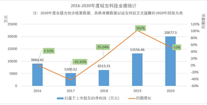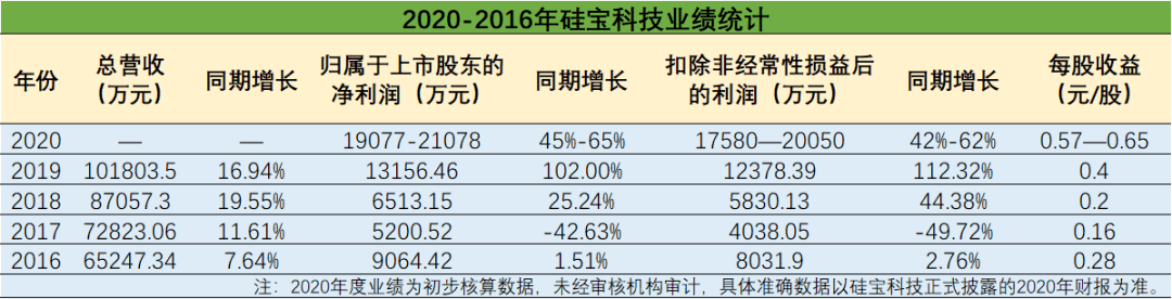 硅宝科技近日发布2020年度业绩预告,预计2020年归属于上市公司股东的净利润为1.91亿元-2.18亿元,比上年同期增长45%-65%,扣除非经常性损益后的净利润为1.76亿元-2.01亿元,比上年同期增长42%-62%。