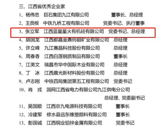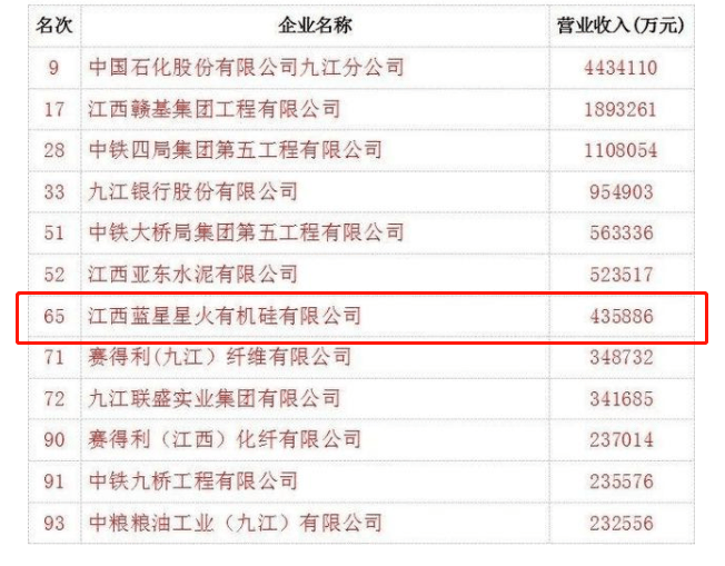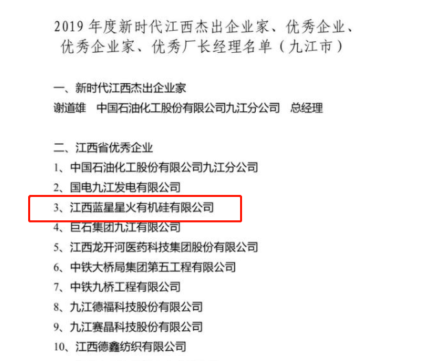 本月28号, 江西省发布的2020江西企业100强榜单,星火有机硅2020年度营业收入43.85亿,位列65位。同时入围“2019年度新时代江西杰出企业家、优秀企业、优秀企业家、优秀厂长(经理)”等多个称号。