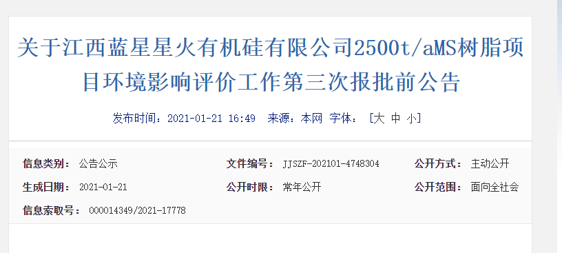 近日永修县人民政府网对江西蓝星星火有机硅有限公司2500t/a MS树脂项目环境影响报告书进行了第三次公示。