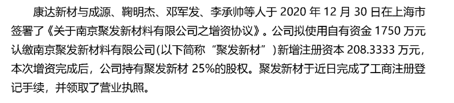 康达新材:关于对外投资签订股权增资协议的进展公告