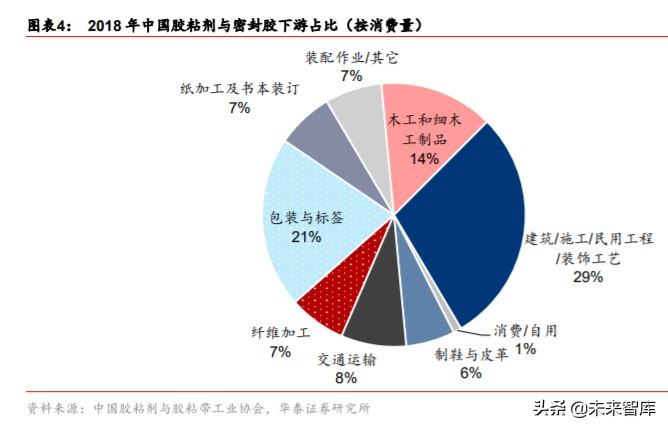 (2)门窗装饰:建筑装饰及门窗用胶和房地产行业关联度大,受融资偏紧、三四线城市 期房销售等因素影响,2014 年 11 月以来房屋新开工向房屋竣工传导周期拉长。19 年下 半年竣工增速开始反弹,我们预计 20 年竣工好转趋势不变,同时住宅及非住宅翻新需求 随房屋使用年限增长而增长,增量+存量房屋装修面积 20 年同比增速 4.2%。19 年门窗装 修用 RTV 胶 17 万吨,以此增速计算我们预计 20 年达到 18 万吨/25 亿元。