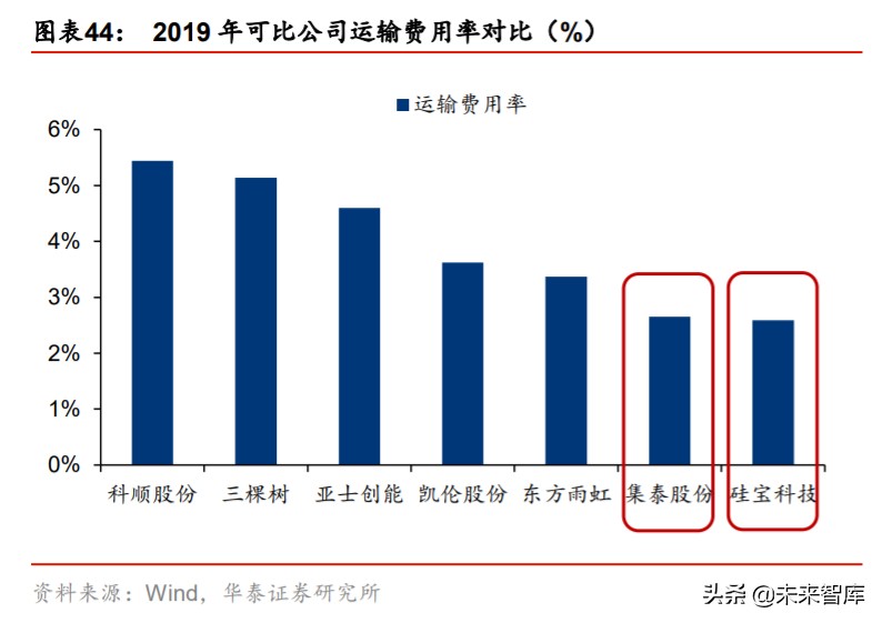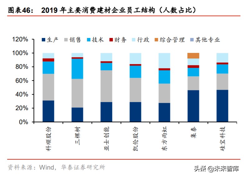 密封胶产品功能属性更强,生产成本占比高但销售费用占比低,而消费建材产品渠道和审 美性相对更强。相较于涂料、防水行业龙头,密封胶上市公司运输费用占收入比重均处于 低位,硅宝主要通过全国性的生产与销售布局降低运费,2019 年末全国有 9 家子公司、4 个销售分公司,并在全国 30 多个省市有约 300 家经销商。集泰股份则以直销为主,进行 集中化生产再转运至各地销售,并通过同物流供应商合作以降低费用率。另外从人员结构 看,密封胶企业生产人员占比多,而销售人员占比少,主要系密封胶龙头重点绑定大客户, 19 年硅宝与三棵树的直销:经销收入占比均为 4:6,但销售费用率较三棵树低 13.5pct, 渠道属性和品牌拓展相对较弱。