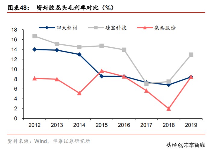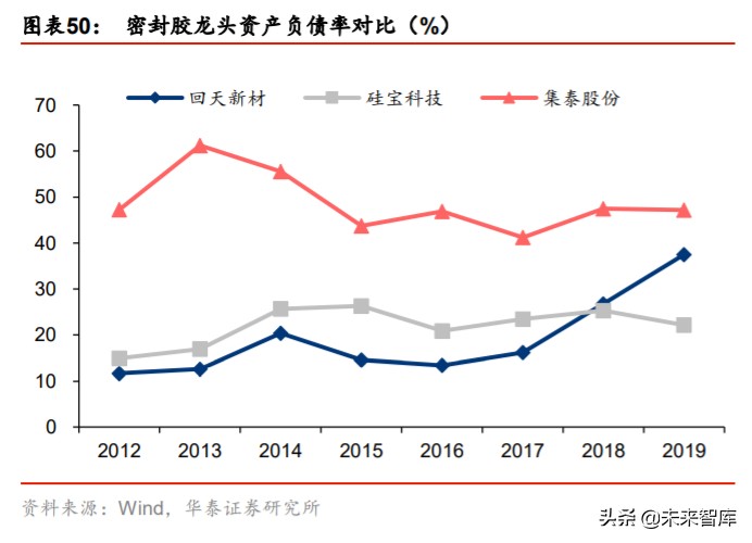 从密封胶行业内部来看,原材料价格下行,利润率提升有望推动龙头 ROE 回升。回天新 材/硅宝科技/集泰股份 19 年 ROE 较 18 年均有提升,同比分别提升 2.7/7.3/13.5 pct。在 资产周转率和杠杆保持相对稳定的基础上,主要系 17-18 年上游原材料 DMC 的价格大幅 度波动,而价格提升滞后反应,导致密封胶龙头企业 19 年毛利率均有大幅上涨。