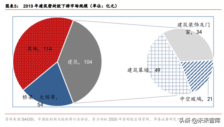从下游市场看,幕墙、门窗及装饰、中空玻璃三大建筑传统领域用密封胶市场规模分别为 49/34/21 亿元,合计 104 亿元,剩余市场主要为基建及装配式市场等非传统建筑领域用胶。 其中有机硅室温胶(RTV)室温胶占比 70%,市场规模约 72.8 亿元;根据东方雨虹 2020 年建筑密封胶宣传材料测算,17 年桥梁、大坝等用密封胶约 50 亿元,按照 18-19 基建投 资增速 3.8%计算,19 年市场规模约 54 亿元,剩余为其他基建等建筑领域用胶。