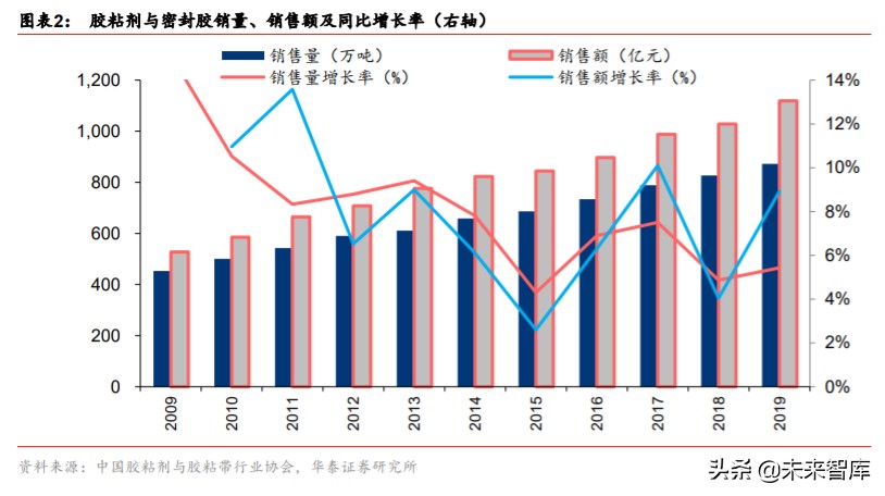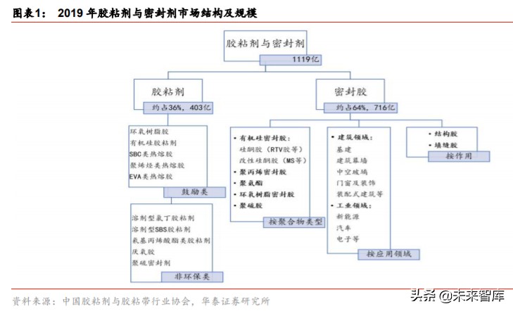 2019 年胶粘剂与密封胶市场规模合计超千亿元,其中密封胶占比超过 60%。根据中国胶 粘剂和胶带工业协会的统计,2019 年我国胶粘剂(仅具备粘接作用)与密封胶(主要起 接缝、密封作用)两类产品合计销售量/销售额分别达 872 万吨/1119 亿元,同比分别增长 5.4%/8.9%,10-19 年 CAGR 6.8%/7.8%。2019 年胶粘剂/密封胶销售额分别为 403/716 亿元,占比 36%/64%。根据《中国胶粘带和胶黏剂市场报告及“十三五”发展规划》, 到 2020 年末,我国胶粘剂销售额将达 1328 亿元,预计 20 年行业边际新增市场规模约 209 亿元。