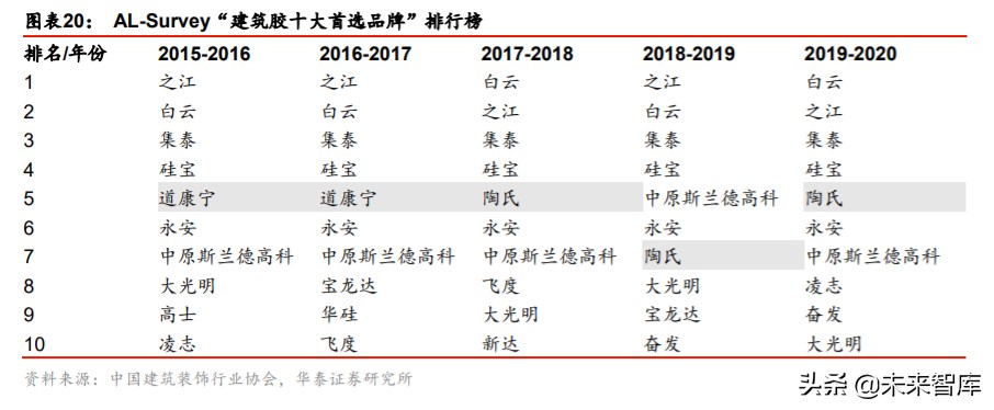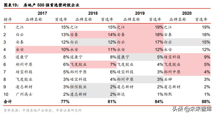 集采驱动国产密封胶龙头市占率提升。与五金行业类似,建筑密封胶并非最终产品,一般 需与幕墙、门窗等产品结合使用,因此广泛采用“甲指乙供”的供货模式。密封胶企业通 过招投标入库以后,后期由经销商在房企选定的合格供应商库中选择具体供应商,品牌、 价格、服务、资金等则是房企考核重要因素。根据中国房地产业协会的统计,密封胶企业 TOP10 首选率自 17 年 77%提升至 20 年的 88%,中小型厂家份额被进一步挤占。此外, 国内龙头企业在价格、交货服务等方面较外资龙头更具优势,根据房地产 500 强评选结果, TOP10 密封胶供应商仅有道康宁一家外资企业,2020 年上榜品牌全部为国有品牌,而中 国建筑装饰协会评选的建筑密封胶十强品牌中也仅有 2 个国外品牌上榜,未来随着集采模 式的进一步发展,国产密封胶龙头市占率有望持续提升。