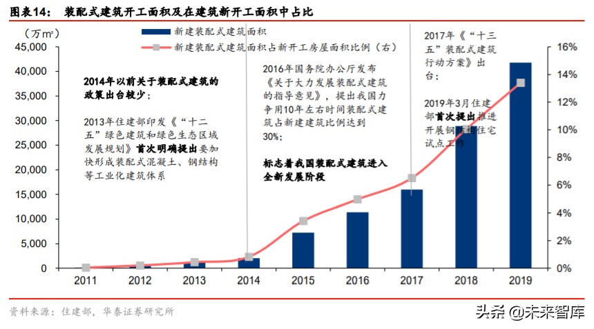 装配式建筑进入快速成长期,未来 5 年新增面积有望超 40 亿平。2019 年我国装配式建筑 面积约 4.2 亿平方米,同比增长 44.64%,新建装配式建筑面积占新建建筑面积的比例约 13.4%,较 18 年提升 3.4pct。2017 年《“十三五”装配式建筑行动方案》规划要求,到 2020 年全国装配式建筑占新建建筑的比例达到 15%以上,其中重点推进地区要高于 20%, 国办发《关于促进建筑业持续健康发展的意见》中要求,到 2025 年装配式建筑占新建建 筑的比例要达到 30%,假设 20-25 年每年新建建筑面积的增速为 2%,装配式建筑渗透率 平均每年增加 3pct(最终 2025 年达到 31.4%),我们测算 2025 年装配式新建建筑面积约 11 亿平,20-25 年 CAGR+17.6%。