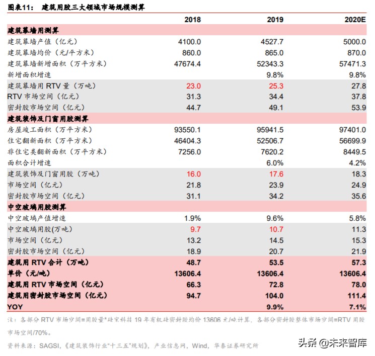 受益于三大传统领域的持续增长,我们预计 20 年建筑用 RTV 市场规模 78 亿元,同比增 长 7.1%。若按 RTV 占建筑用密封胶市场规模的 70%测算,幕墙、门窗装饰、中空玻璃三 大传统建筑领域用密封胶市场分别为 54/36/22 亿元,合计共 111 亿元。我们的测算基于 对三大传统细分市场的分析: