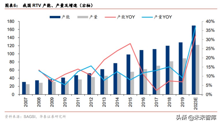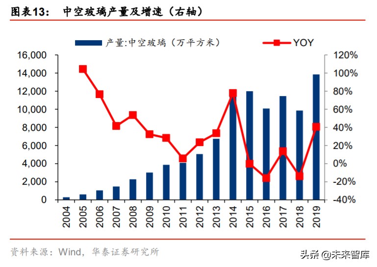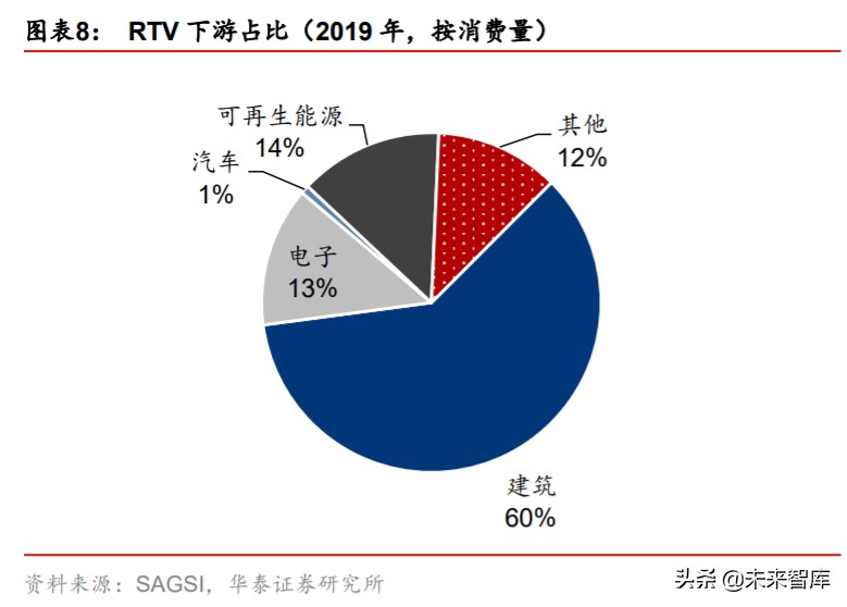 (3)中空玻璃:节能保温隔热和密闭技术是我国鼓励发展的建筑重点节能技术之一,中 空玻璃则是门窗节能材料的代表,在中空玻璃二道密封上,硅酮类密封胶的耐老化、使用 寿命、环保等综合性能得以充分展现。以 18-19 年中空玻璃 RTV 产值增速均值 5.8%计算, 我们预计 20 年中空玻璃用 RTV 胶市场规模达达 11 万吨/15 亿元。