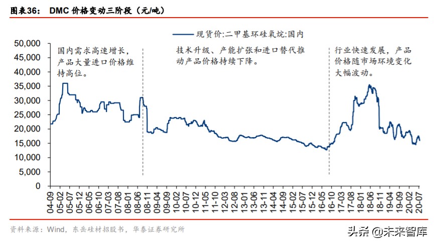 DMC 价格进入底部整固阶段,有利于有机硅密封胶毛利率提升。我国 DMC 价格变动可 分为三个阶段,08 年之前供给不足价格处于高位,08-16 年国内产能扩张带动价格下行, DMC 价格于 2016 年 7 月创历史新低,全球 DMC 装置普遍停产、减产。16 年之后供给 增速减缓、环保限产,叠加国内地产景气及出口大增,DMC 价格迎来 2 年上行周期。18 年 9 月以来 DMC 价格大幅下滑,主要受以下因素影响:1)地产等领域需求回落;2)金 属硅、甲醇等原材料价格回落;3)合盛、新安等新增供给逐步投产,供大于求格局重现。